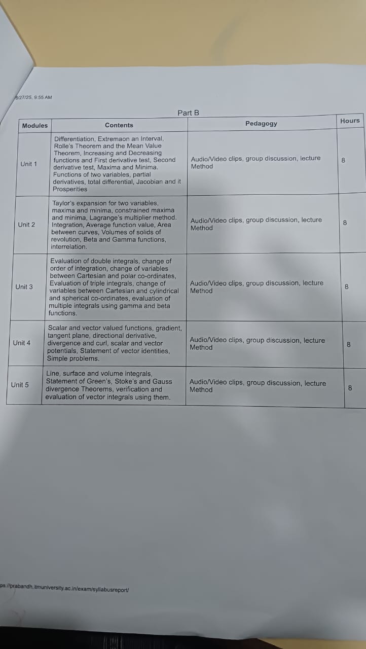 Taylor’s expansion for two variables, maxima and minima, constrained maxima and minima, Lagrange’s multiplier method. Integration, Average function value, Area between curves, Volumes of solids of revolution, Beta and Gamma functions, interrelation. |